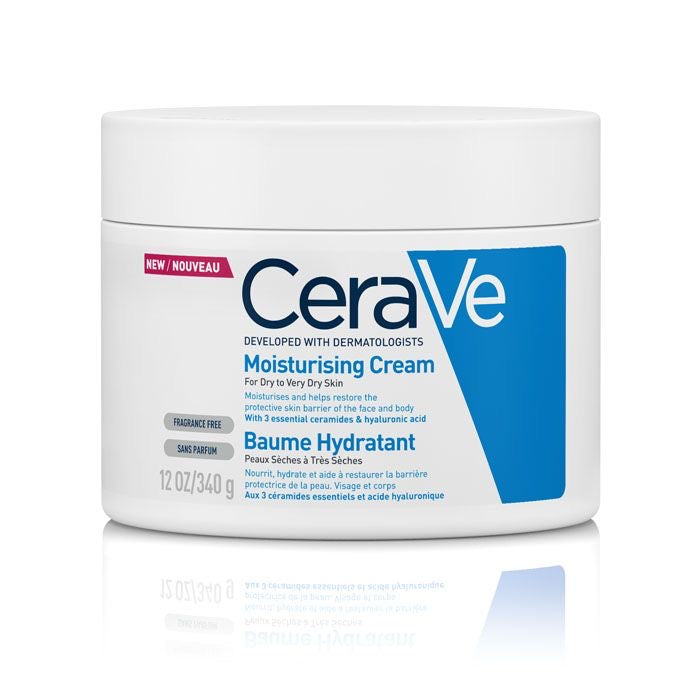 "CeraVe Moisturising Cream (Baume Hydrant), 340g: Provides long-lasting hydration and helps repair dry, damaged skin. Rich, non-greasy formula with Hyaluronic Acid, Ceramides and Glycerin."